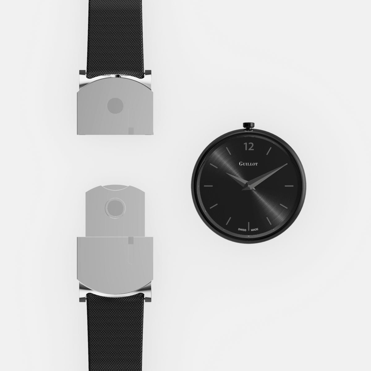Pour un porté au poignet, les cornes sont les éléments de fixation venant se glisser au dos du boîtier pour attacher votre bracelet. Les cornes Guillot disposent en plus d'un fermoir rabattable et aimanté. Pour la première fois dans l'histoire de l'horlogerie, celles-ci sont amovibles. Vous pouvez donc créer des combinaisons de montres bicolores. Alliez cornes noires ou acier à un boitier de montre couleur or rose pour une apparence unique.