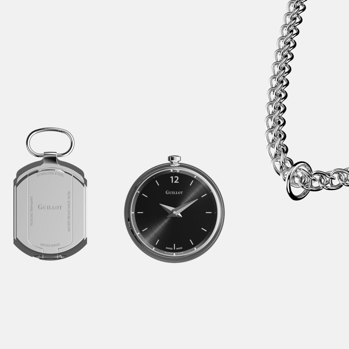 Pour un porté gousset ou pendentif, Guillot a développé un élément de fixation venant se glisser au dos du boîtier. Celui-ci dispose, en plus d'un anneau d'accroche permettant d'accueillir des chaînes de tailles différentes, d'un fermoir également rabattable et aimanté.